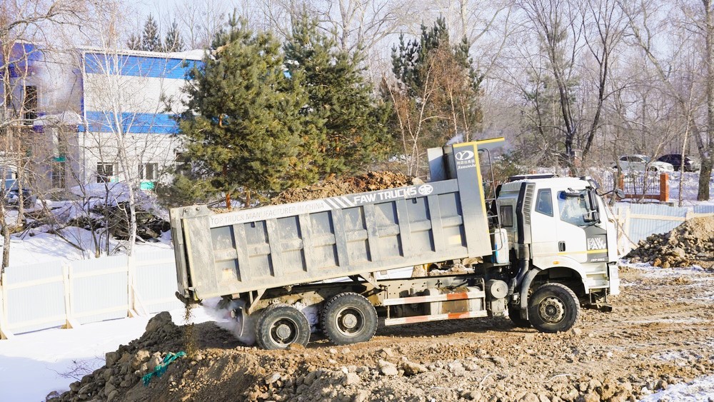 Январские холода не мешают строительным работам на территории будущего храма в честь всех святых Церкви Русской, посвященного Победе во Второй мировой войне в городе Хабаровске.