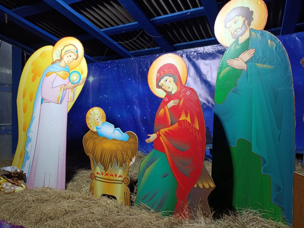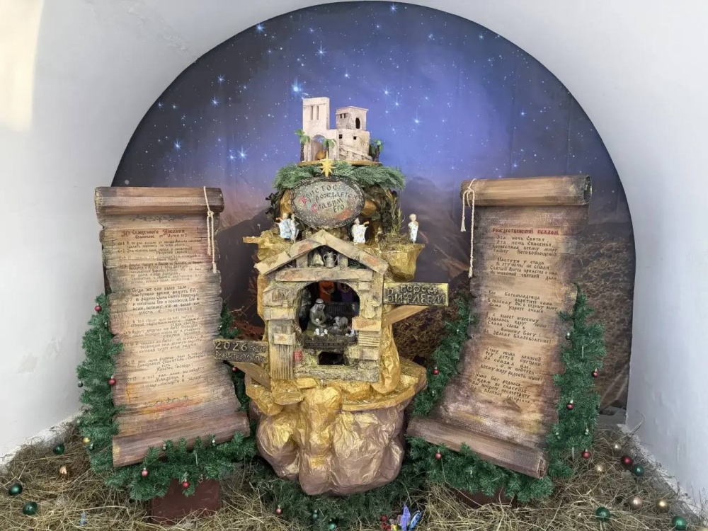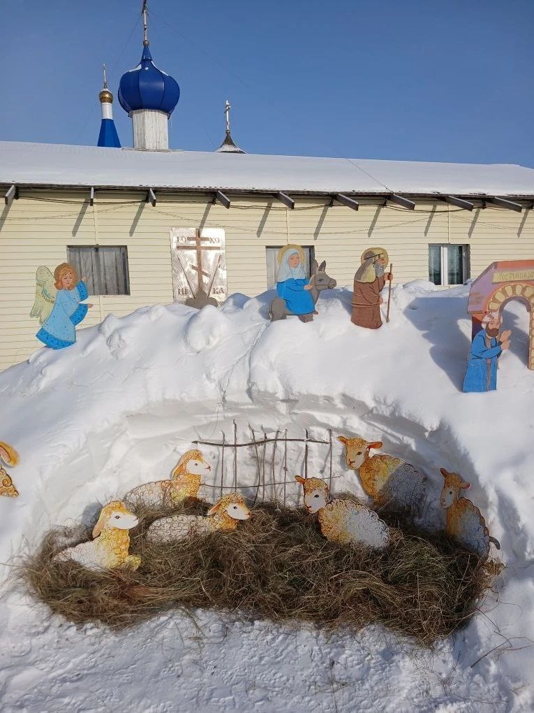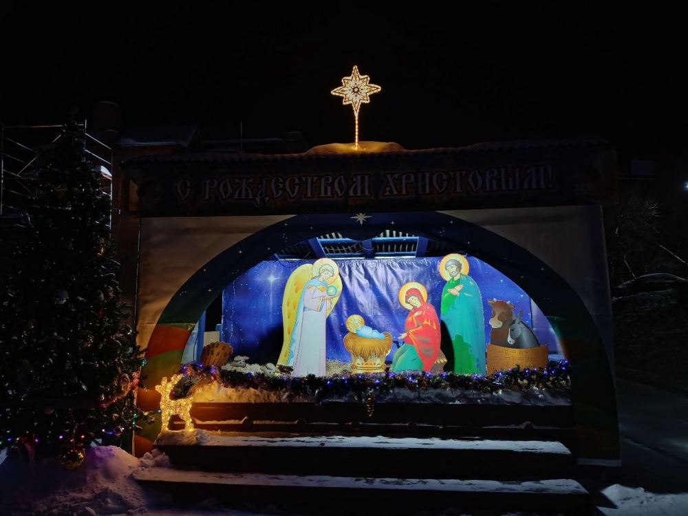На территории строящегося храма в честь Введения во храм Пресвятой Богородицы появилась целая история Рождества с вифлеемскими домами на улице. Идея наглядно воссоздать историю и проникнуться духом Рождества пришла руководителю воскресной школы Татьяне Валентиновне Неделько. В инсталляции можно увидеть Богородицу с Иосифом, которые стоят возле гостиницы, город Вифлеем, ангела, явившегося пастухам, волхвов, Рождественскую звезду и сам вертеп. Фигуры сделаны в технике ватной игрушки.