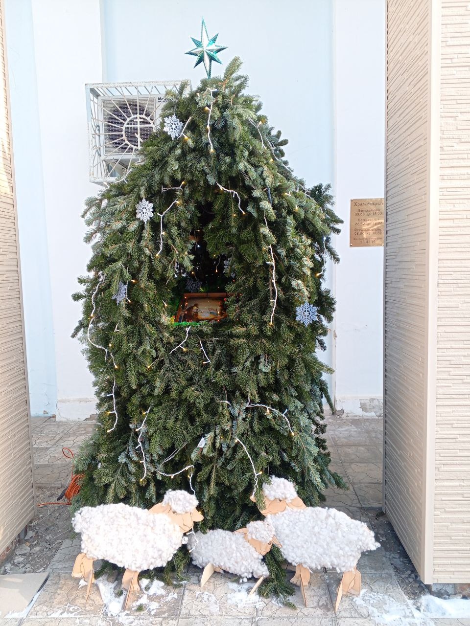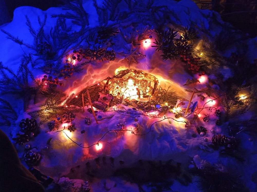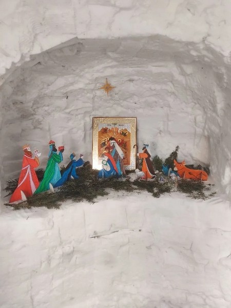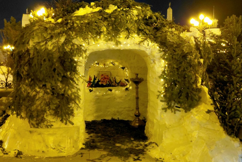 Возле Покровского храма появилось два вертепа: хвойный и снежный.