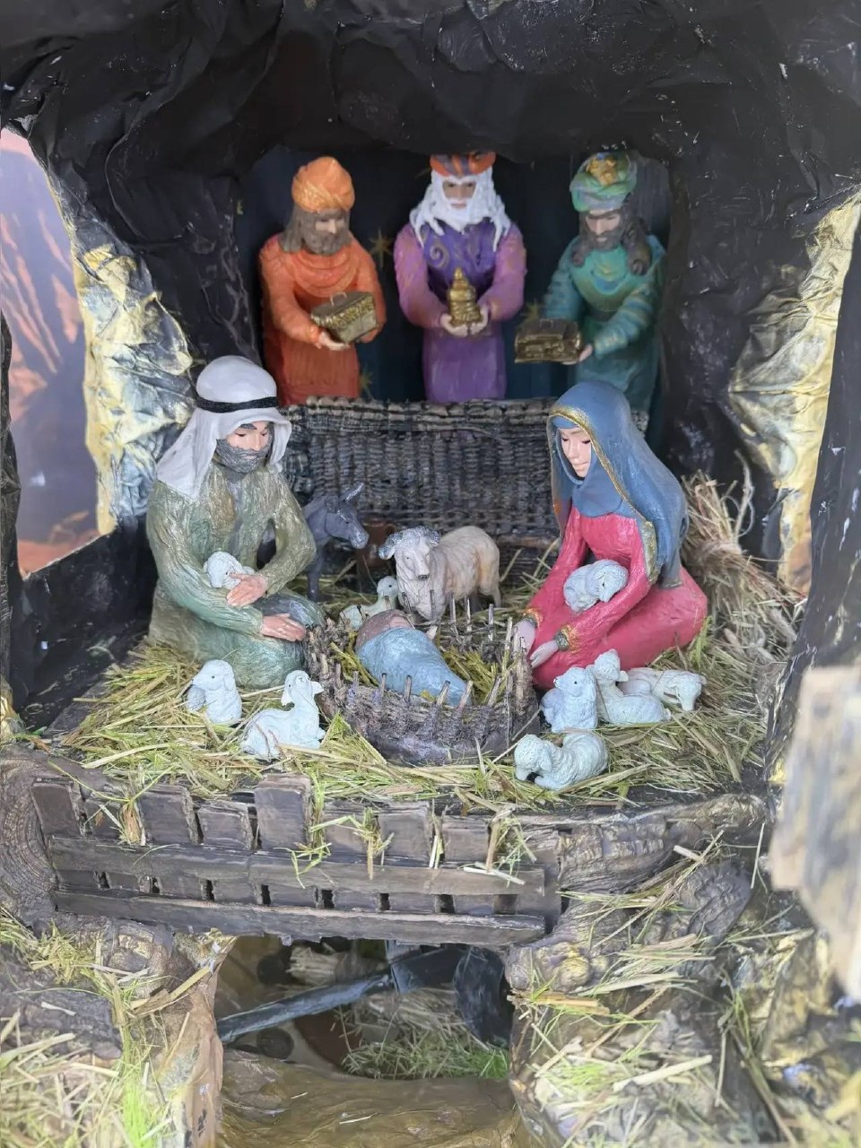 Этот вертеп изготавливала прихожанка Ольга Беспалова в течении года в технике папье-маше. Бумага показала себя надёжнее всех других материалов. Какие-то элементы можно обновить, добавить дополнительные фигуры, как было сделано в этом году.