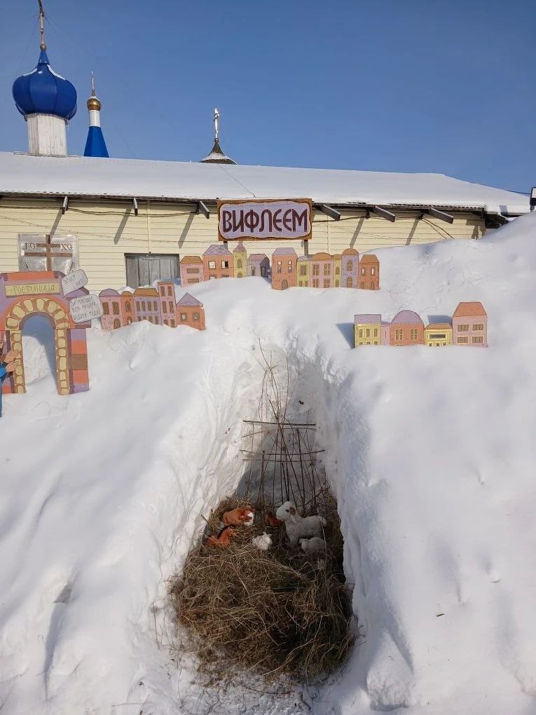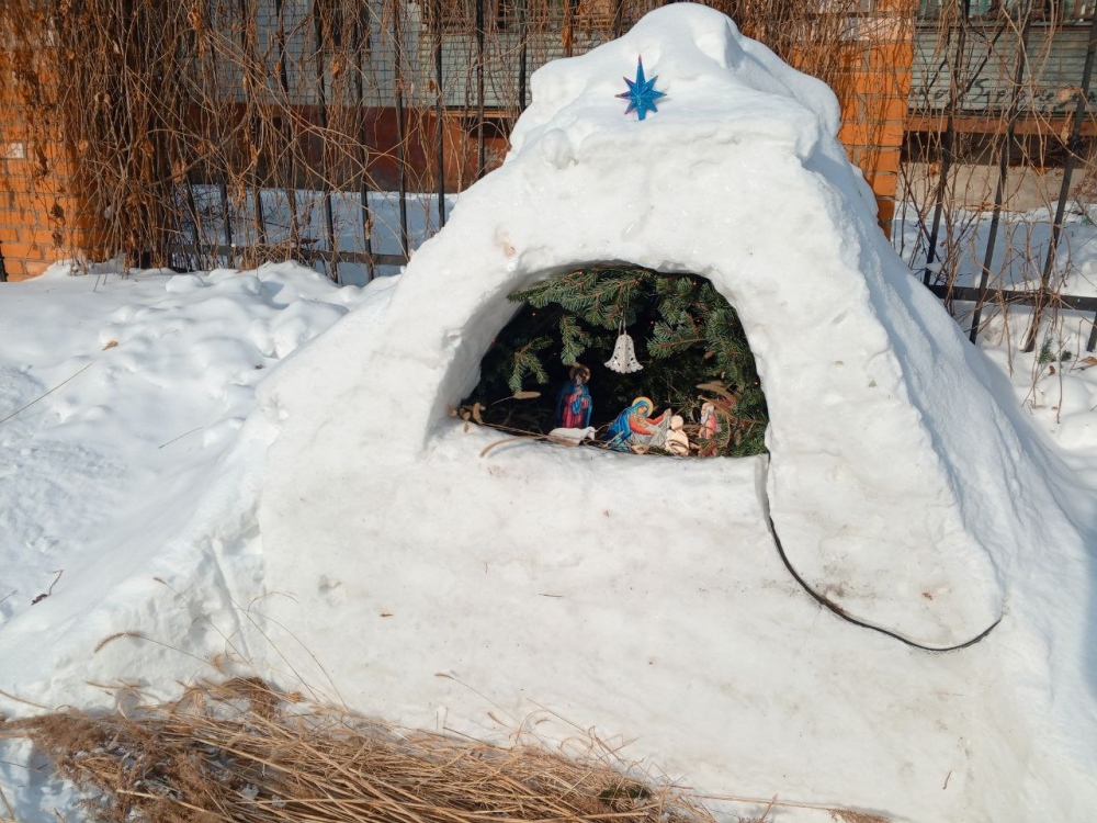 Снежный вертеп у Градо-Хабаровского собора Успения Божией Матери. Фигурки для вертепа изготовили на занятиях ученики воскресной школы.