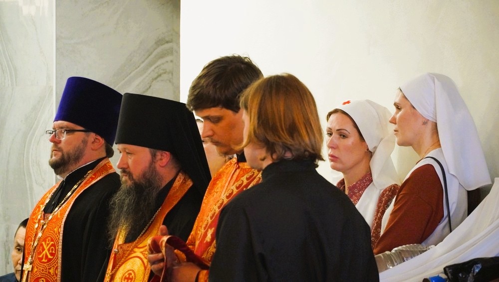 На молитву собрались раненые военнослужащие, медицинский персонал и сестры милосердия Свято-Елизаветинского сестричества. Владыке Артемию, который возглавил праздничный молебен, сослужили: секретарь Хабаровской епархии иеромонах Николай (Белозёров) и хабаровские священники.