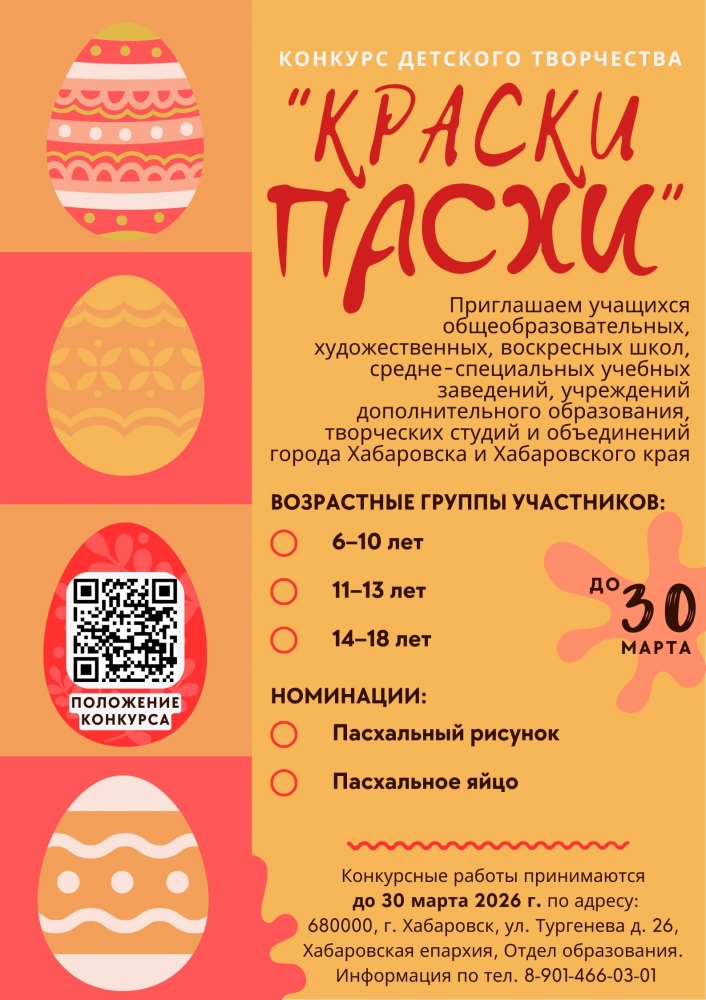 С 16 февраля по 30 марта (включительно) 2026 года Отдел образования Хабаровской епархии принимает работы на региональный конкурс детского творчества «Краски Пасхи».