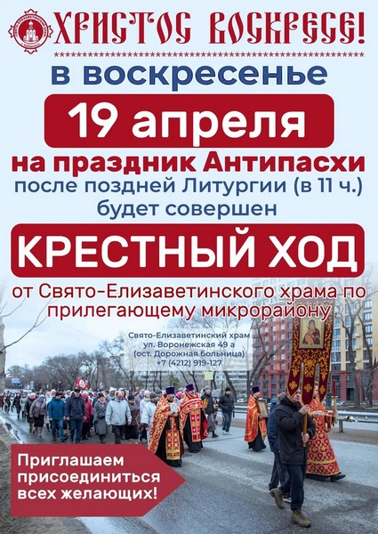 В воскресенье, 19 апреля, в день Антипасхи, от храма в честь святой преподобномученицы Великой Княнини Елизаветы пройдет традиционный Крестный ход по микрорайону.