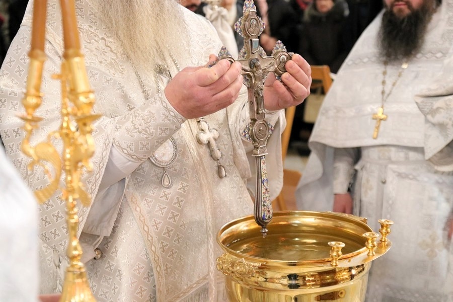 По заамвонной молитве при пении тропарей «Глас Господень на водах» священнослужители вышли в центр храма, где митрополит Артемий совершил Чин великого освящения воды, после которого окропил верующих святой водой.